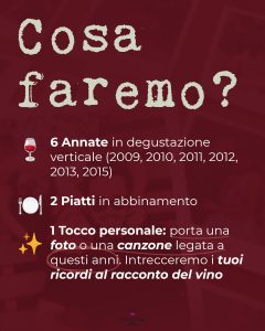 Tra un calice e l’altro, arricchiremo la serata con un momento conviviale e creativo: ciascuno porterà un aneddoto, una storia, una fotografia o una canzone legata ad ogni annata in degustazione, intrecciando così i ricordi personali al racconto del vino.