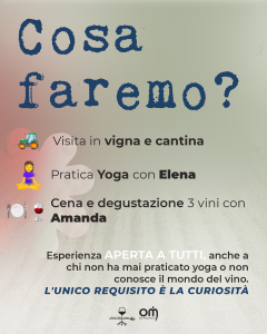 Cosa ti aspetta ✨ : • Visita in vigna e cantina • Yoga rigenerante con Elena • Cena con degustazione di 3 vini e 3 piatti